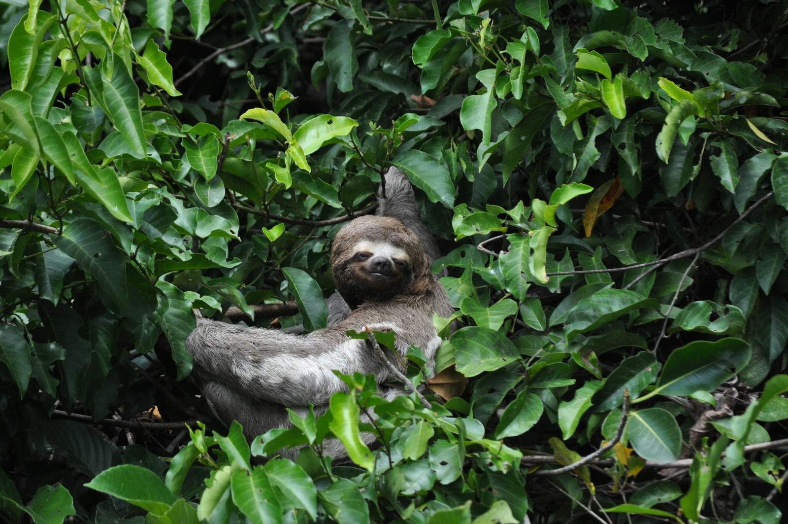 Gdy wypływamy na jezioro udaje nam się zobaczyć wydry, które łowią ryby i potem leżąc na grzbietach energicznie je pałaszują. Nie podpływamy bliżej niż na 50 metrów, ale i tak słychać jak jedzą - podobno jedzą średnio 4 kg ryb dziennie, na szczęście podobno tych akurat tu nie brakuje. Gdy dopływamy do brzegu Laura dostrzega leniwca. Zamieszkuje on wysokie partie drzew, więc zwykle podobno niełatwo go dojrzeć, ale my mamy wyjątkowe szczęście, bo ten ulokował się w dość niskich, porastających brzegi jeziora zaroślach, tak więc z łódki mamy na niego świetny widok. Uśmiecha się do nas leniwie, jak przystało na leniwca ...